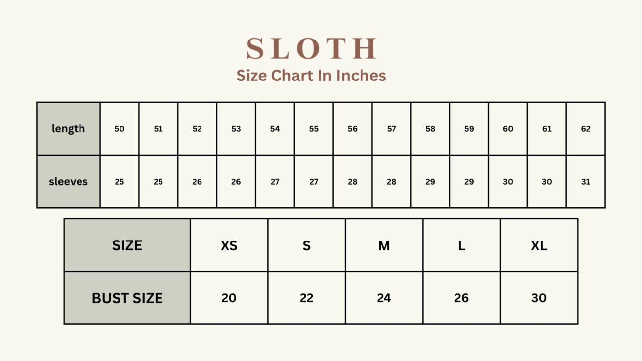 | Length | Sleeves | Size | Bust Size |